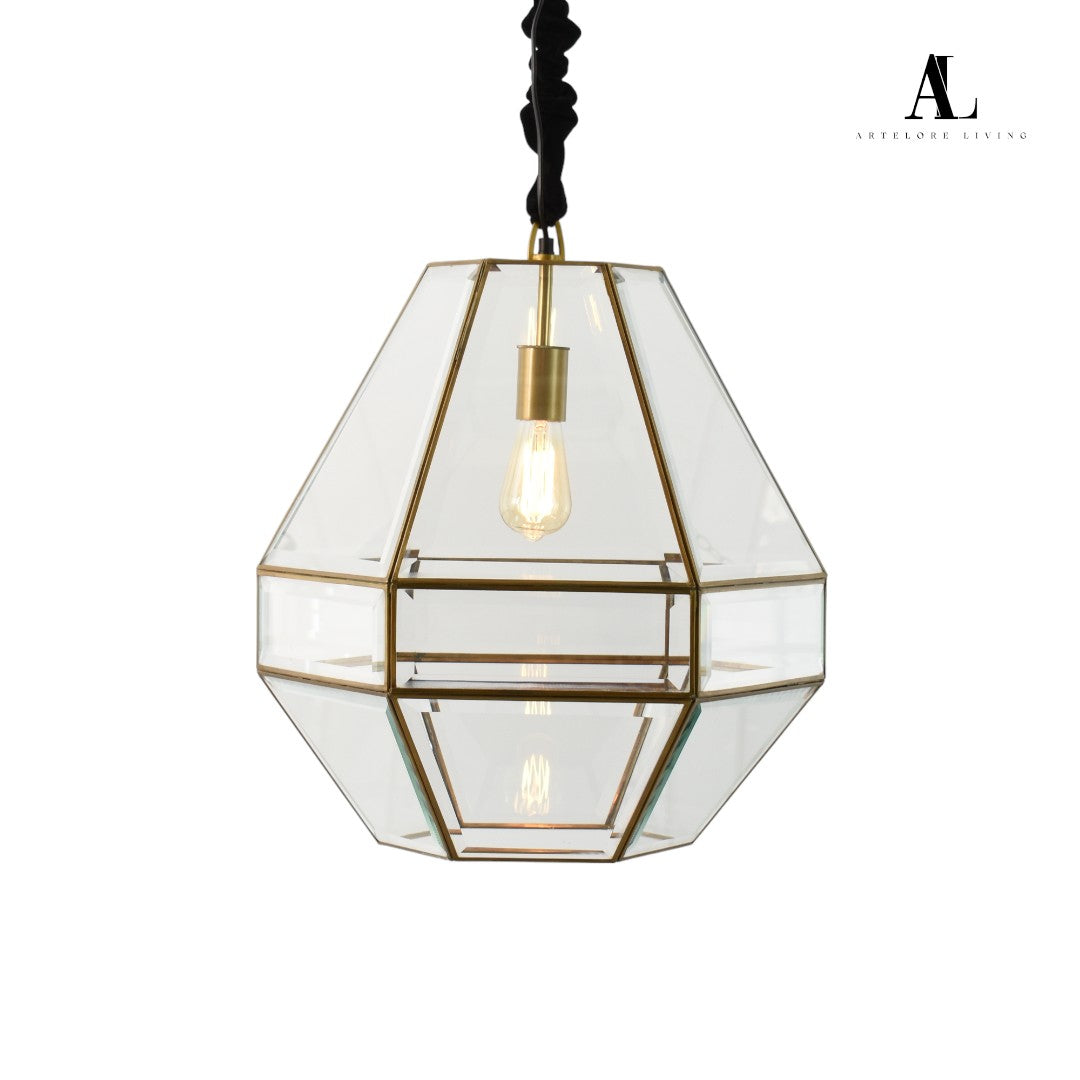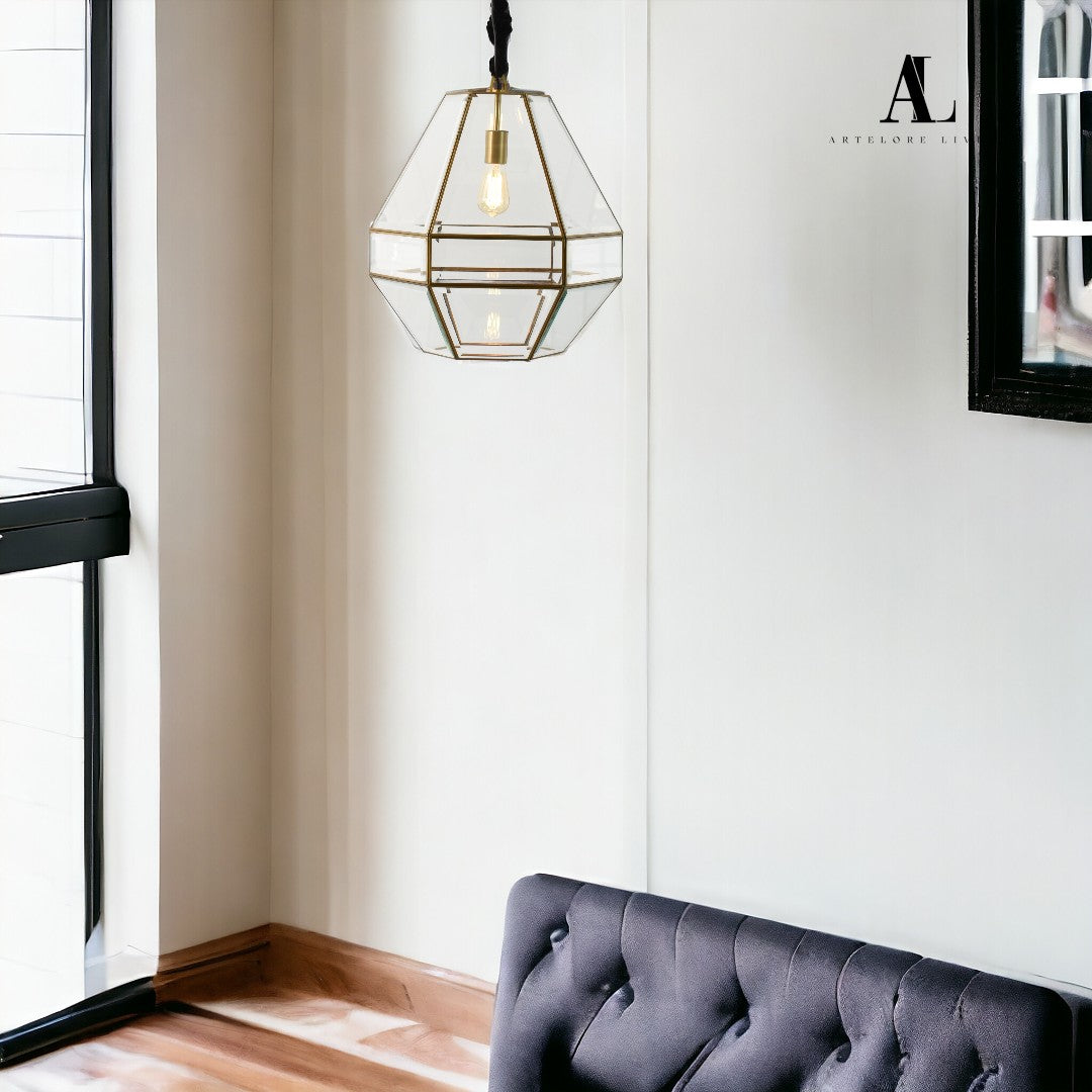 Refined geometry meets luminous elegance in the Aurora Prism Pendant by Artelore Living. Featuring a multifaceted silhouette crafted from clear glass panels and framed in warm antique brass, this pendant light captures and reflects light with stunning clarity. The exposed bulb design adds a modern industrial touch, while the sculptural form makes it a statement piece in any setting. Ideal for contemporary, transitional, or glam-inspired interiors, it shines beautifully over kitchen islands, dining tables, or entryways.