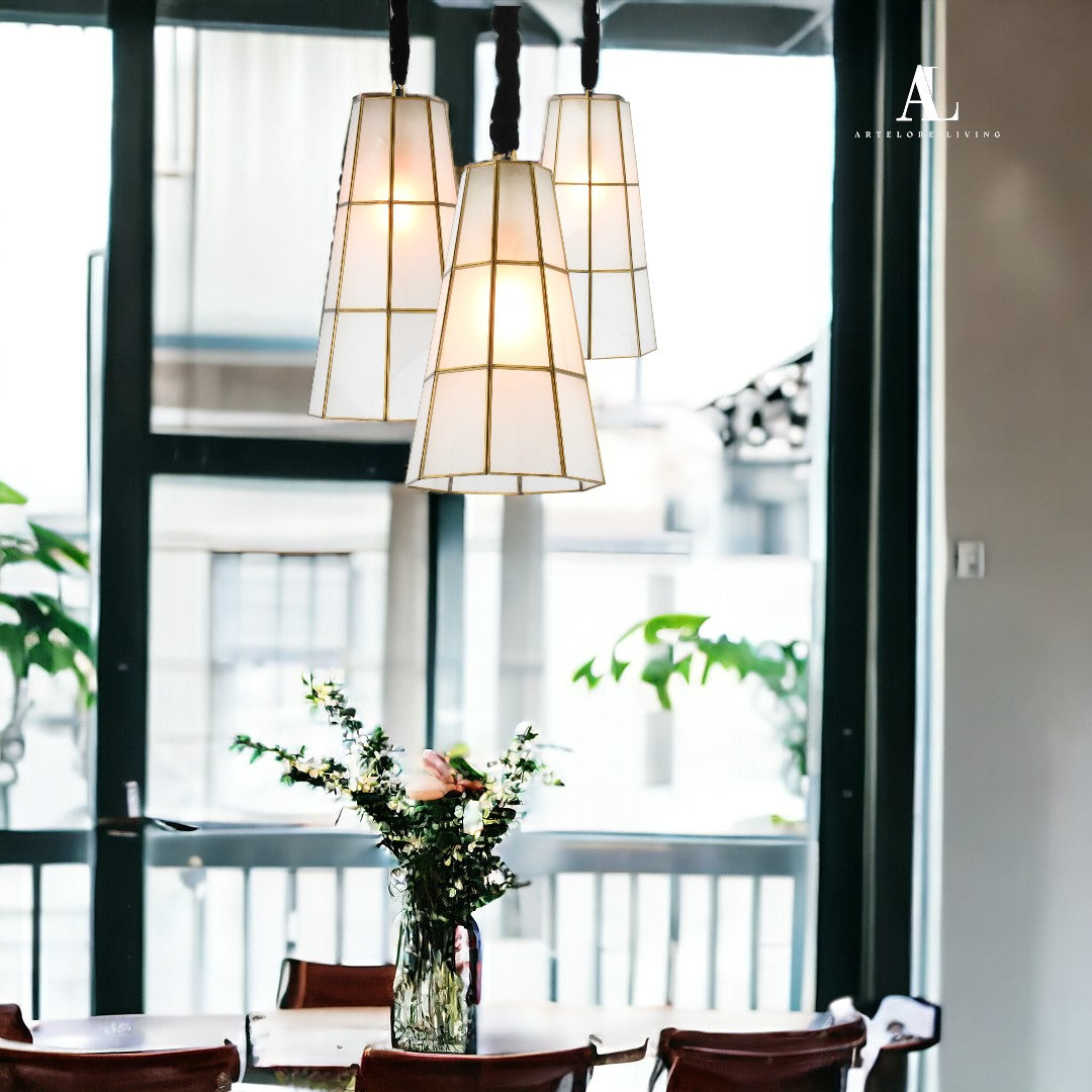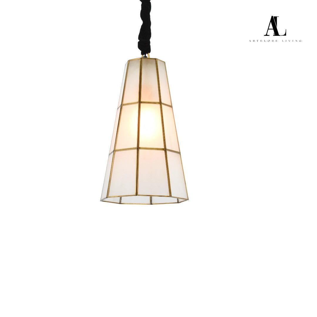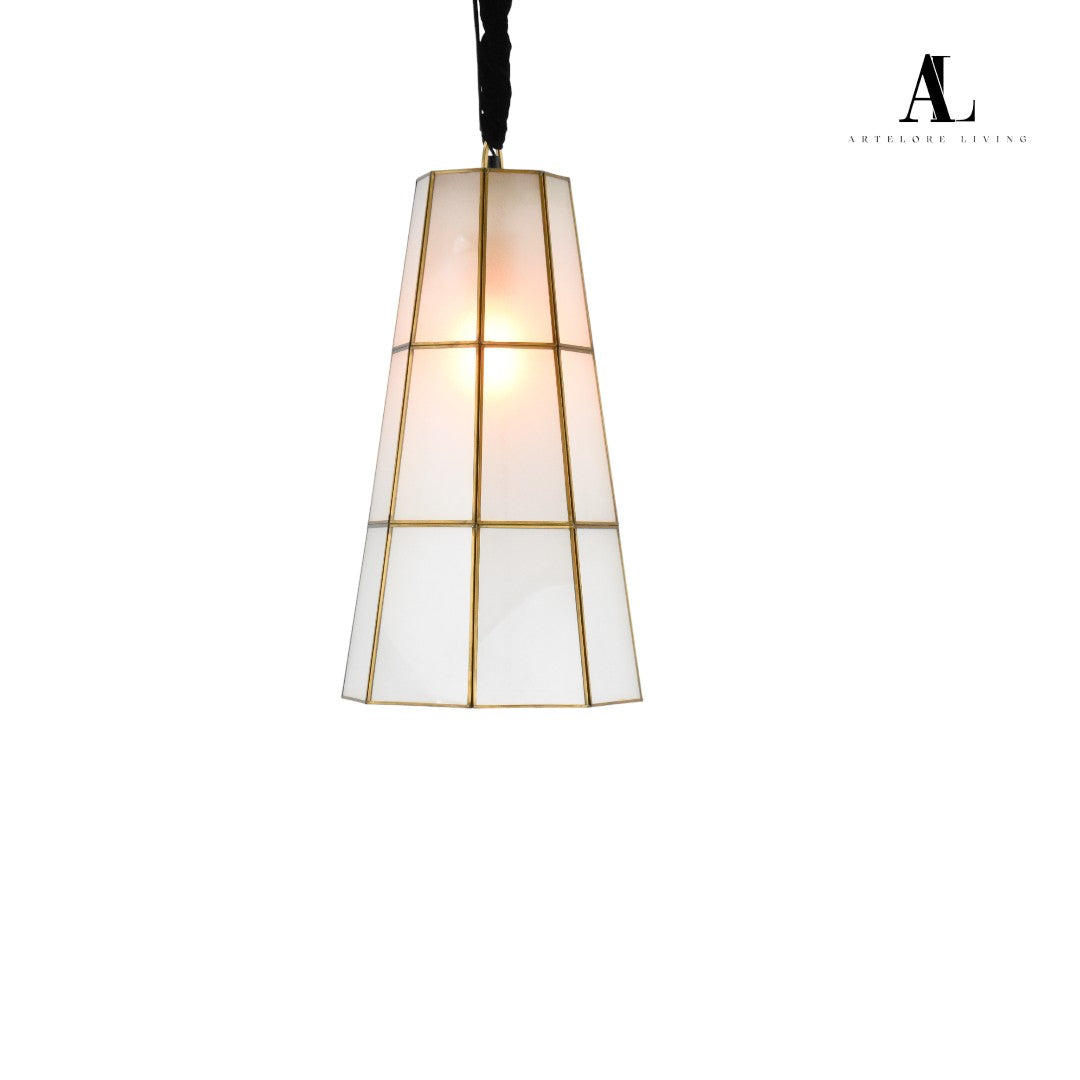 Elevate your interiors with the Aurora Tapered Pendant Light from Artelore Living. This elegant fixture features a gracefully tapered silhouette crafted from frosted white glass panels, delicately outlined with golden metal accents for a refined, geometric look. The warm, ambient glow emanates through the translucent surfaces, making it a perfect addition to modern and transitional spaces alike. Suspended from a chic, fabric-covered cord, this pendant combines timeless design with contemporary sophistication.