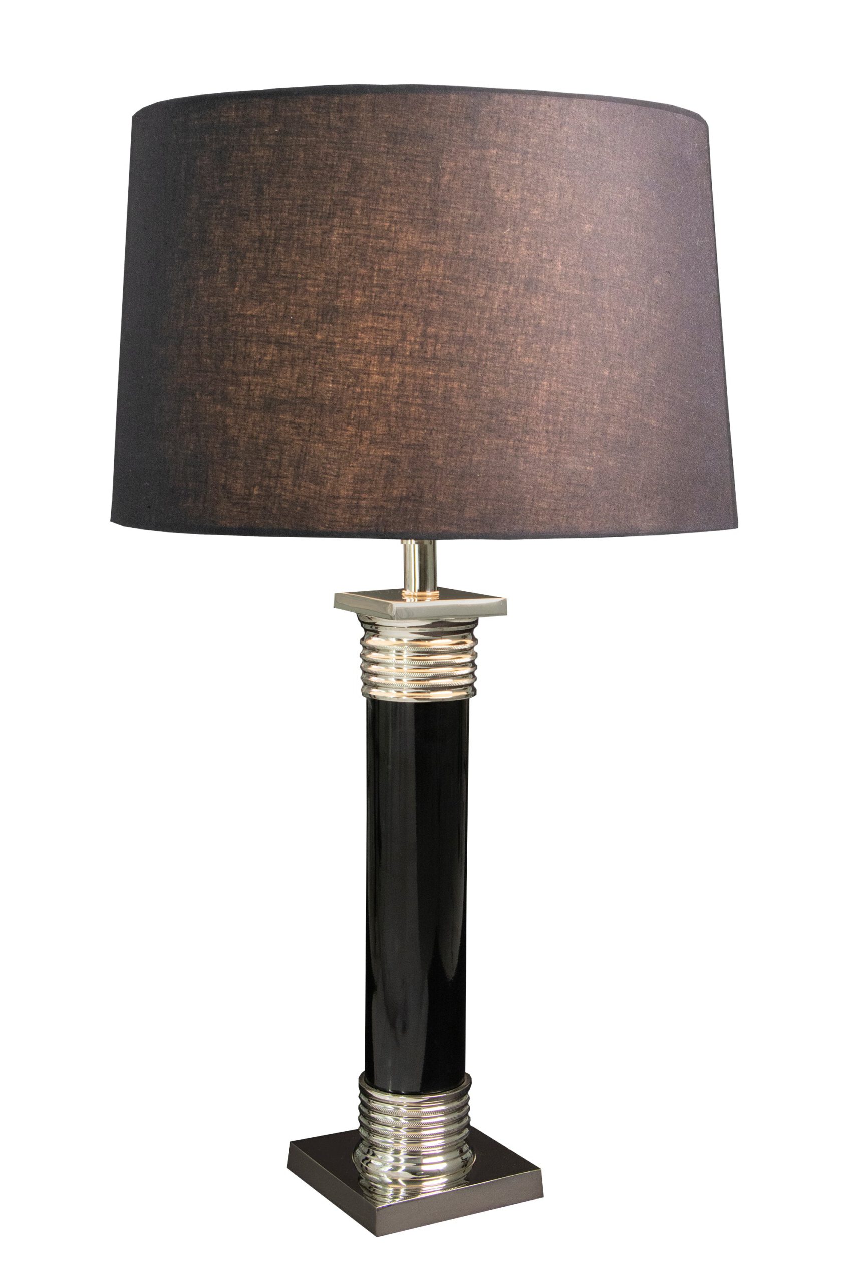 This beautiful lamp (6″x6″x22.5″) combines functionality with the classic glamour we’ve come to expect from the iconic International brand. This table light combines brass with a black powder finish and nickel plating that captures and reflects the light. Brass pattern is embedded in the base for added luxury. The black color shade features the distinctive classic design. Each elegant piece is lovingly handmade by expert craftsmen and will add a touch of glamour to your home.