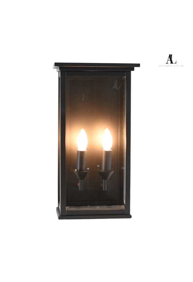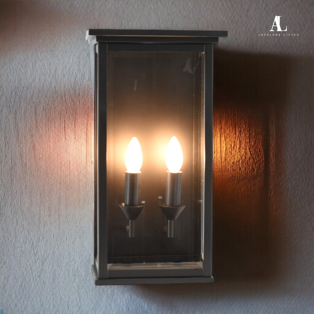 The Chamberlain Double Candle Wall Sconce is a timeless lighting piece that fuses classic charm with modern craftsmanship. Encased in a sleek matt black-finished metal frame and clear glass panels, this wall sconce features three candle-style bulbs mounted on elegant cone-based holders that evoke the warmth and sophistication of traditional lanterns.