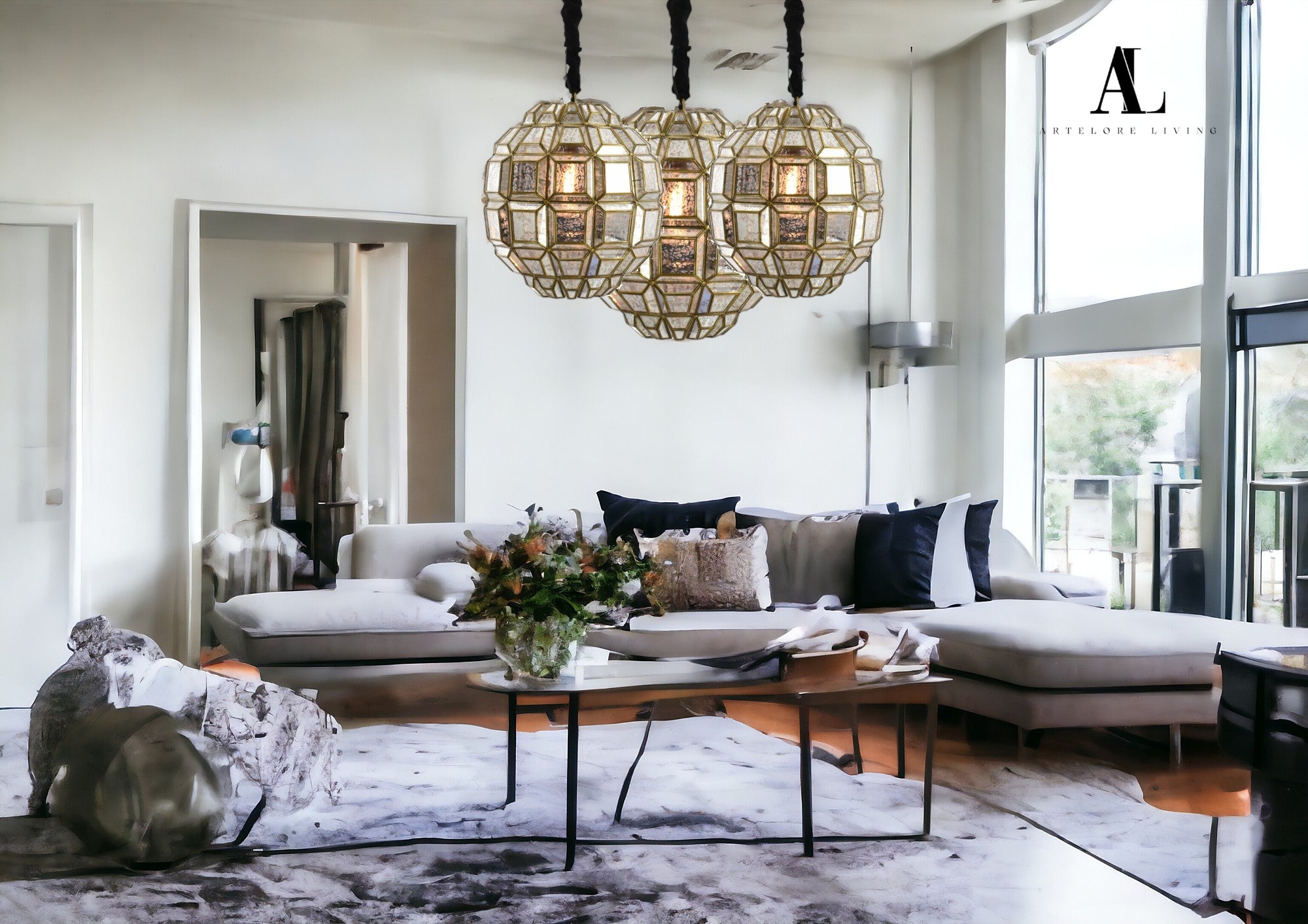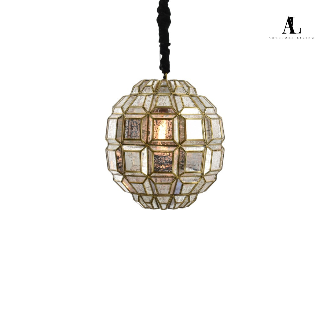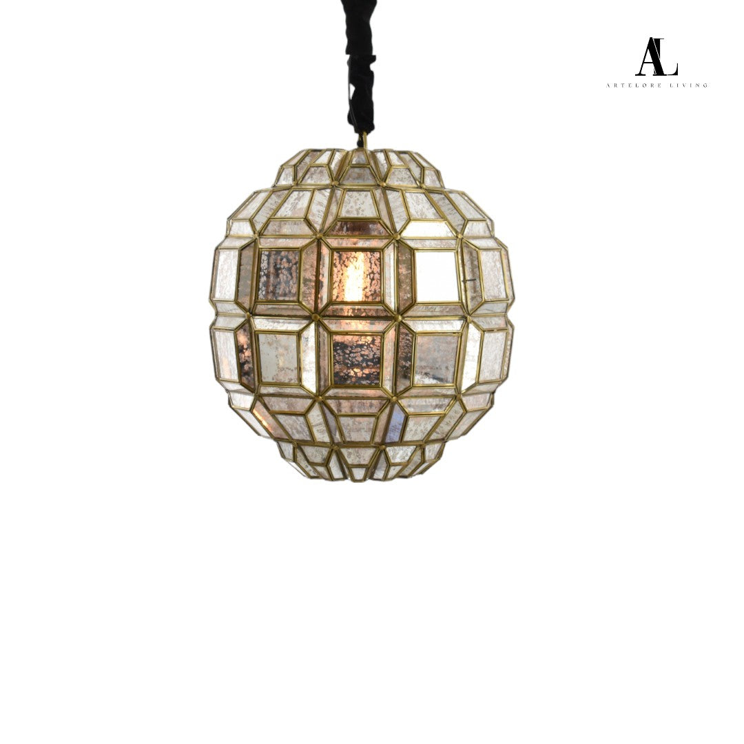 Elevate your space with the exquisite elegance of the Artelore Living Pendant Light. This statement piece features a spherical design composed of intricately framed, mercury glass panels with a vintage, antiqued mirror finish. The geometric brass framework adds a touch of opulence and sophistication, reflecting a warm, ambient glow when lit. Perfect for dining rooms, entryways, or living areas, this pendant blends timeless artistry with modern charm to create a luxurious focal point in any interior.