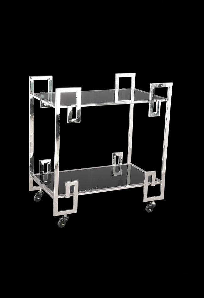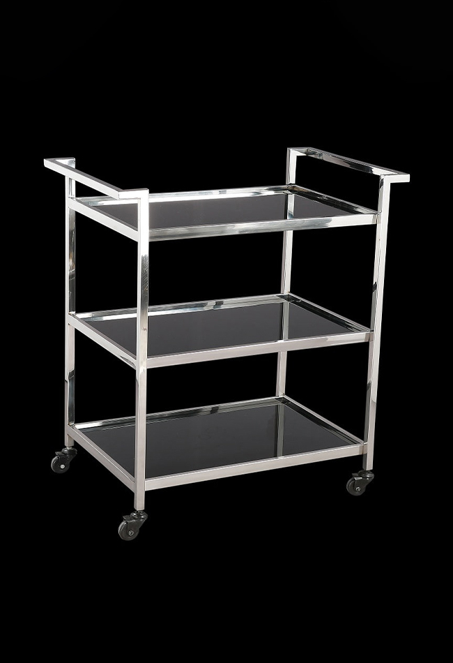 Bring some glitz and glam to your events with this amazing bar trolley (30″x18″x33″). Stainless steel with an ultra classy black glass shelves and featuring two glass shelves with rails to stop any rogue drinks from toppling off. Handles on each side and castors wheels on the bottom make the cart easy to move around.